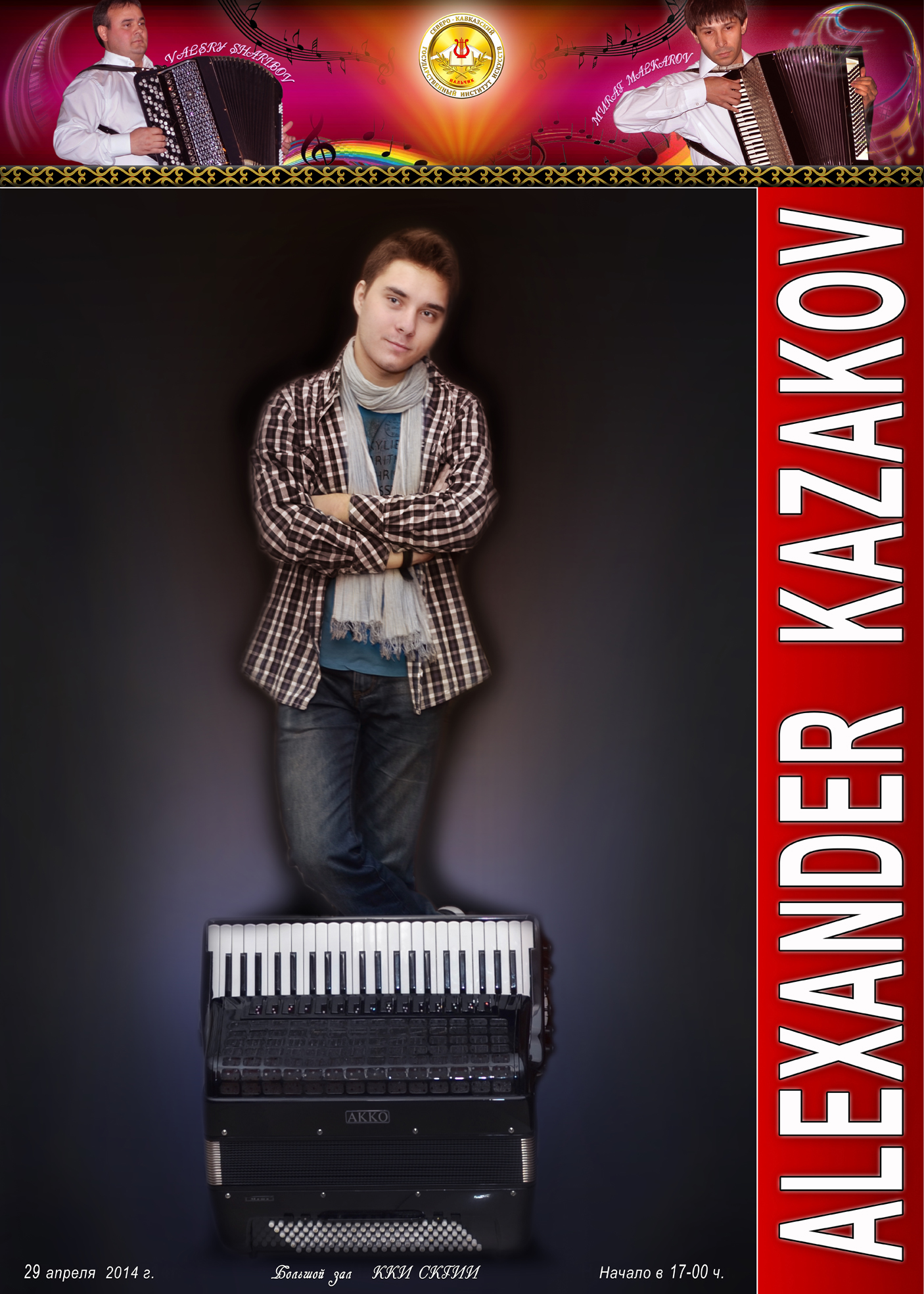 Выпускник ДМШ №3 города Нальчика Александр Казаков сегодня уже заканчивает отделение народных инструментов ККИ СКГИИ с огромным багажом программы разноплановой по жанровым и стилевым направлениям, а также новыми творческими идеями.